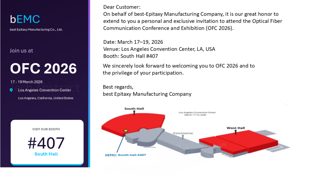 best Epitaxy Manufacturing Co. Ltd. (bEMC) was established in November 2017. The factory is located in Zhunan Science Park, covering an area of 5,378 square meters. It has several Aixtron MOCVD machines and wafer testing lines to produce 4″ and 6″ epitaxy wafers. Provide leading CPO design and professional production services.